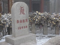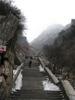 本日は、タイシャンという世界遺産に観光へ出かける。歴代の中国皇帝が即位の儀式を行った場所らしい。ここの入山料も高額である。まだまだ、中国では観光は贅沢な行為なのか? 観光地としての「泰山」の評価は、「★★☆☆☆」である…。霧が出ていたことや寒かったことも、評価が伸びなかったことに影響しているかもしれない。 この泰山は、“山”なので、行きは登りになる。これが、なかなかきつい…。基本的に石の階段が続く。ずっと続く。永遠に続く(当然、実際には限りがある…)。 山頂付近は、本格的な“冬”だった。霧が出て見通しがきかない中、風もあり雪が舞っていた。かなり、寒かった…。北海道クラスの寒さだったと思う…。