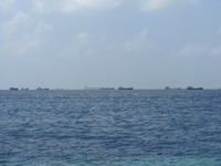海岸沿いでボケ〜ッとしていると、木材を運んでいたトラック4台分の運転手がやってきた。この木材はインドネシア産で、なんと船を造るそうである。モルディブらしい使い道!!! 運転手の方たちと1時間以上も話をする。なかなか興味深い話をすることができた。日本のことは好きなようで、消波ブロックを造ってくれたことへの感謝も述べていた。日本の得意の分野ですからね!港湾工事という無駄に思える(もちろん全てではありません)公共工事で培った技術が、こんなところで役に立っているんだな〜。 沖にズラ〜ッと並んでいる船は、港に停泊しきれないのでステイしているとの話も聞けた。波の静かなことが多い、モルディブならではの発想だなあ!!!