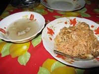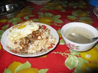 ピィまでの道は、田舎道をひたすら北上する。道路は舗装されているものの、砂塵が開いた窓から入り込む。さすがに目が痛くなってきた…。途中、ドライブインで休憩して昼飯。今回は麺類に挑戦。美味かった! 予定時間から少し遅れて、ピィのバスターミナルに到着。そこから、サイカー(タクシー的な乗り物)で、Mitsuさんが知っている宿に移動。宿のオーナーが親切な方で、次の予定地までの日程を相談する。オーナーの提案どおりに日程を決定。