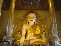 この日は、シュエナッタン・パヤーという寺院で“お祭り”があるとのこと。U先生、日本語教室の生徒さん(スィー・トゥさんも)、チョ・ソウさん(U先生の友人:昨日も一緒に宴に参加)、Miiさんと、車をチャーターして向かう。 寺院の周辺は大混雑。1年に1回の祭りとあって、近郊の田舎からも人がやってくるそうだ。その人達を見こんでの出店なのか、その人達が出店しているのか、数多くの露天が混雑に拍車をかける。日本とは違い、生活用品の露店が多く、地元の方も商品を吟味して普通に購入している。日本語教室の生徒さんが最も関心を示したのは、アウンサン親子のグッズ販売店であった。