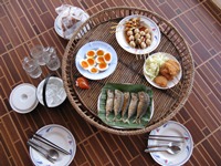 予定どおりにスリン駅でSekiさんと再会!!!Sekiさんは、お変りなく元気なご様子。オリエント伯爵は、すっかり日焼けして日本人らしからぬ姿になっているようである。日差し、強かったからな〜。 スリン駅からSekiさんの友人のミニコップさんの家に行き、3人で食事をする。店も注文も、現地情報に通じている方ならではのセレクト。それに加えて、この地方の“コメ”は美味い。二人前以上の“コメ”をたいらげてしまった。至福の時間である!!! その後、今晩宿泊させていただくお宅へ移動し、畑を散歩したり、木になっているイチジクを食べたり(北海道人には珍しい体験…ちなみに初体験)、椰子の実を取ったり、椰子の実を割ったり、椰子の実ジュースを飲んだり、椰子の実の果肉を食べたり…(また飲み食いしている)、またまた至福の時間。