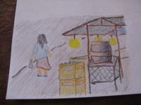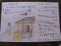 宿に戻って、恒例のエアメールをかく。今回は、初公開してみる。まずは、イラストを色鉛筆で描く。写真を見て分かるように、オリエント伯爵には絵心がない。それなのに、なぜイラストを描くことにしたのかは本人にも分からない…。ちなみに、元になっている景色は、各国の基本情報(→現在のHPには存在しません)にアップしている景色である。「ずいぶん違うじゃないか」と思われた方…そのとおりなんですよ…。 続いて、文章を付け加える。エアメールをかいているときに思い浮かんだ、各国の感想をそのままに書いている。最後に、2枚の紙を貼りあわせて封筒を作成して宛名を書いて終了である。
