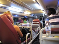 今回の寝台バスは、中国・ベトナムでおなじみの3列セパレートタイプのバス。このタイプには良い思い出がないのだけれど、ダブルベッドタイプでの1人寝が難しいとのことだったので、知らないオッサンとの添い寝を避けるためにあえてセレクトした。 レセプションのお姉ちゃんとの約束どおり、窓側で真ん中の席。しかも、前の外国人が我儘な方らしく、「ここじゃ、いやだわ」みたいな感じで隣の友達と最後尾に移動してくれた。その椅子のリクライニングを解除するとポッカリと空間が空き、そのスペースも使える。写真から想像できますか?兎にも角にも、今回も贅沢な寝台バスの旅となった。