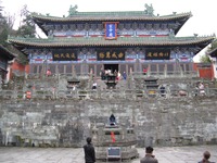 そんなこんなで、どうにかウータンシャン行きのバス乗り場を見つける。とある書籍情報よりも安い価格でウータンシャンへ。とある書籍情報よりも都合のよい場所でバスは停まる。 バスを降りると、周りの人たちの動きに合わせて、オリエント伯爵も移動する。チケットを購入して、無料バスで山の中へGO!バスは、山道をスリリングなスピードで駆け上がる。 一度バスを降りて、道教寺院を訪れる。なかなか趣きのある寺院である。再びバスに乗って移動し降車後に観光、またまたバスに乗って移動し降車後に観光。贅沢な移動をしているように思われるかもしれないけれど、バスはすべて無料(チケット代金に含まれている)である。このシステムには感心させられた。 しかし、快適なバスの旅もここまでである。これから頂上までは歩いて登るのが基本ルート。歩くのが嫌ならば、途中まで戻って、異なるバスルートを通り、最後はロープウェイを使うことになる。オリエント伯爵は、迷わずに“歩いて”頂上をめざすことをセレクトした。