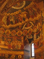 WiFiは快調につながるので、次の訪問国の情報を入手。これが、なかなかに大変だった。予想以上に時間がかかったけれど、そのかいがあって、どうやら移動ができそうである。 15:00から、スチャヴァの街中を散策。もちろん、この街に寄ったのは、オリエント伯爵基準の世界遺産「モルドヴィア地方の教会群」があるから。この世界遺産は、周辺に点在する8つの教会がまとめて登録されたもの。スチャヴァからも、1つの教会が登録されている。 登録されているのは、「聖ゲオルゲ教会」。早速、そこに向かう。この教会群は、外壁に施されている絵画が見所なんだけれど、かなり痛みが激しい。まあ、そりゃそうだよね。外壁なんだから…。でも、内部は素晴らしかった。明日は他の教会を訪れる予定なので、評価はその時にまとめてすることに。