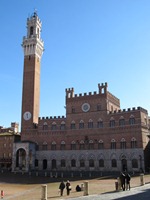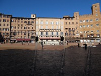 シエナには無事に到着。この街、オリエント伯爵は気に入った。くねくねとした通り、高くそびえる石造りの家々、極めつけは美しすぎるカンポ広場。唯一の欠点は道に迷いやすいということかな。観光地としての「シエーナ歴史地区」の評価は、「★★★★☆」である。 まずは、カンポ広場へと向かう。プッブリコ宮殿も美しい。中に入ろうか迷ったけれど、外観だけで十分に堪能できたので我慢することに。写真では、広場の美しさが十分に伝わらないのが残念…。