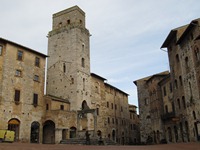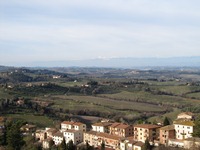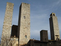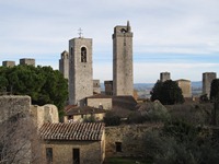 ちなみに、サン・ジミニャーノもオリエント伯爵基準の世界遺産。観光地としての「サン・ジミニャーノ歴史地区」の評価は、「★★★☆☆」である。この街も素晴らしい。その素晴らしさをつくっているは、青空に向かってたつ塔である。現存しているのは14本らしい(数えてないのでホントかどうかは不明…)。 バスを降りて、チステルナ広場からポポロ宮殿へ。そこから先は、適当に歩きまわる。この街は、規模も小さいし、道もわかりやすい。少しばかり迷っても、すぐに自分のいる位置が分かる。 高いところから街を見たかったので、城塞に向かうことにする。それらしいマークを見つけたので、城塞があるって分かったんだけど…。街の眺めは期待していた程ではなかったけれど、周辺の丘陵地の眺めは抜群だった。う〜ん、トスカーナ、綺麗だなぁ〜。