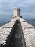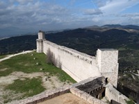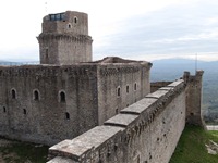 やっと上の方が明るくなってきた。どうやら、出口があるようた。出てみると、予想通りに、そこは東側の遠い方の塔だった。ここらかの風景もまた、素晴らしいものだった。 西側には四角い箱のような塔と近い方の塔が見え、南側はアッシジの街を一望することができ、東側はサン・フランチェスコ聖堂を臨むことができ、北側には田園風景が広がっていた。ちなみに、左側のサン・フランチェスコ聖堂とサンタ・キアーラ教会の外観写真は、ここから撮影したものである。 眺めを堪能して、再び暗い暗い階段を通り、城壁の中の通路を歩き、近い方の塔を下り、四角い箱のような塔の場所まで戻ってきた。この大要塞は、入場して大正解であった!!!