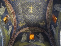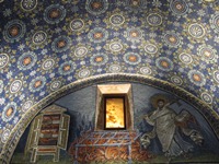 同じ敷地内にあるガッラ・プラチーディアの廟に向かう。いやいや、もう凄すぎる。モザイク画って、こんなに美しいもんだったんですね!ここは“廟”というくらいだから墓なんだろう。こんなに素敵な墓に埋葬されたら、“死後の世界”なんて信じていないにもかかわらず、死後の世界も楽しいかもと思ってしまった。