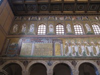 ラヴェンナ最後の観光場所は、サンタポッリナーレ・ヌオーヴォ教会。今までの建物と同じく、外観は見栄えのしないレンガ造り。内部に足を踏み入れると…あれっ???天井、ショボイじゃん…。奥の祭壇もこれといって…。ついに、ガッカリ教会に足を踏み入れてしまったのか…。 いやいや、ラヴェンナに限って、そんなことはありません!この教会のモザイク画は壁面にあったのでした。今までの感覚で探していたので一瞬気がつかなかっただけ。そして、やっぱり、ここのモザイク画もまた素晴らしかった。