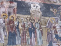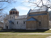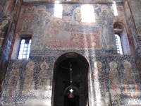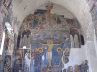 ストゥデニツァに到着。バスを降りて、修道院へと向かう。観光地としての「ストゥデニツァ修道院」の評価は、「★★★☆☆」である。内部のフレスコ画は見事の一言に尽きる。 多くのフレスコ画には、無数の傷がついていた。この傷は、人為的なものに思えた。もし、本当にそうだとしたなら、なんともったいない…。宗教対立の不毛さを再認識させられた。 ここ、内部は写真撮影禁止だったようで、途中で「止めてねっ!」と言われてしまった。すいません〜。でも、撮っちゃった画像については、お咎めなしだったのでラッキー!!! ちかくにある小さな聖堂。「王の聖堂」と言うらしい。たいした期待もなく足を踏み入れてみる。おおっっっ。こちらにも、見事なフレスコ画が残っている。 予想外に楽しい時間を過ごすことができた。この修道院、周囲を石壁が取り囲んでいる。そして、石壁の向こうには、長閑な山並みを見ることができる。なんと、落ち着く場所なんだろうか。