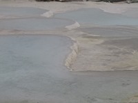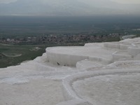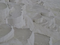 このパムッカレ、不思議な景観を見せてくれる。ここの大地は石灰岩でできている。そこに二酸化炭素を含む弱酸性の雨が降ると、炭酸カルシウムを溶かした地下水となる。更に、この地下水が地熱で温められて、地表に湧きだし温泉となる。更に更に、地表に出てきた温泉中の炭酸カルシウムは再び分離して沈殿し、縁の部分に沈着して堤のように成長する。