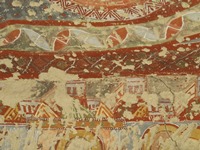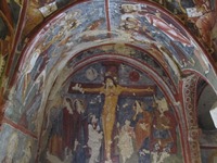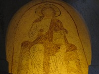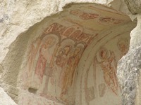 野外博物館に近づくと、ポツンと壊れかけた奇石が1つ。なんと、そこには、剥落が激しいものの間違いなくフレスコ画が残されていた。予想を裏切らず、素晴らしいものだった。内部はかなり期待できると思い、入場料を支払って敷地内へ。