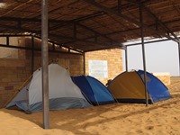 朝陽とともに目覚める。砂漠の中のテント泊、暑さ対策を重視して、インナーだけとしたので、砂がたっぷりテントの中へ(笑)。まあ、想定内のことなので、気にしない、気にしない!顔も体も砂にまみれているのも、想定内のことなので、気にしない、気にしない(笑)!それでも、貴重な水を使って、歯磨きだけはしちゃった(笑)。
