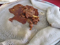 ちなみに、インジェラとは、左の写真の灰色っぽいクレープ状の物体。テフという植物の種子を粉状にして、水で溶いて発酵させたものを焼いたもの。独特の酸味がある。この酸味が、あまり一般的ではないようだ。インクルード・ミー!!!