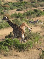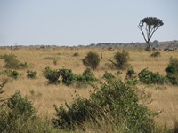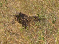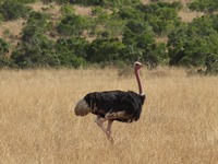 人助けは無事に終了し、車はサバンナを再び疾走する。途中、イボイノシシを発見。でも、すぐに草むらに隠れてしまう。こうなると、ホントに見つけづらい。ライオンさん、あなたの苦労の一端をうかがい知ることができました(笑)。続いて、ダチョウを発見。でも、ムッチャ遠かった。