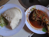 ちなみに、移動中の食事は、贅沢にも車内で注文。昼食はウガリと呼ばれる主食とチキン。ウガリとは、キャッサバやトウモロコシの粉から作った団子状(他にも、いろいろあるらしい)のもの。左の写真を見ると、雰囲気が分かるかな?日本人にとっては、不味いものではないと思う。